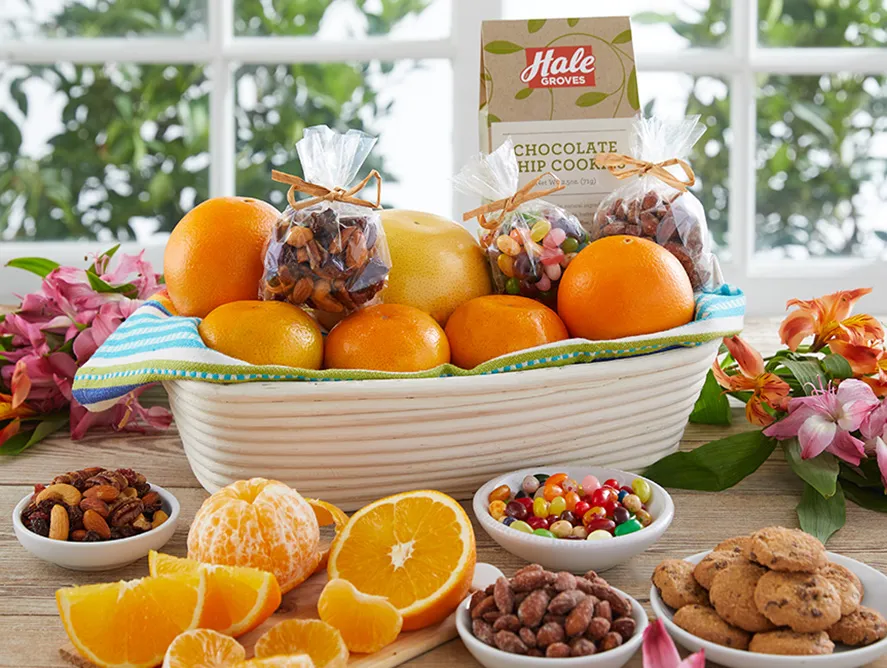 Our just-picked Oranges, Ruby Red Grapefruit and Honey-Sweet Tangerines join an assortment of treats in our rustic, rattan-proofing basket, lined with a colorful striped tea towel. Sure to be a hit with the baker in your life, the sturdy, extra-long oblong proofing basket is ideal for raising bread dough before baking and presenting the finished loaf afterward.