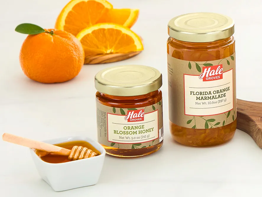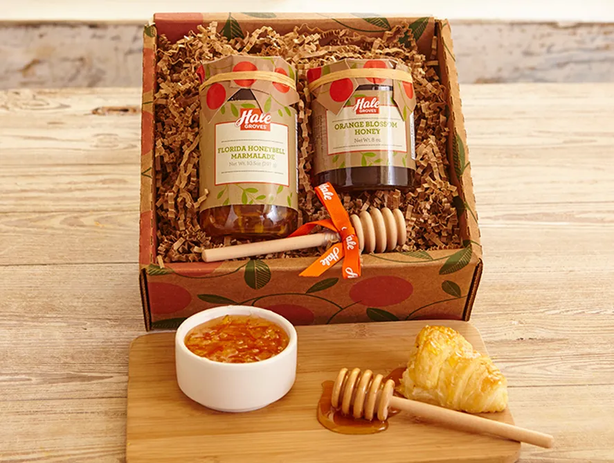 Our Marmalade tastes better because we use only the highest-quality fruit for extraordinary flavor. Hale Orange Blossom Honey is collected from bees that feed from orange blossoms for a taste you can’t get anywhere else. A wooden honey dipper tops off this thoughtful gift.