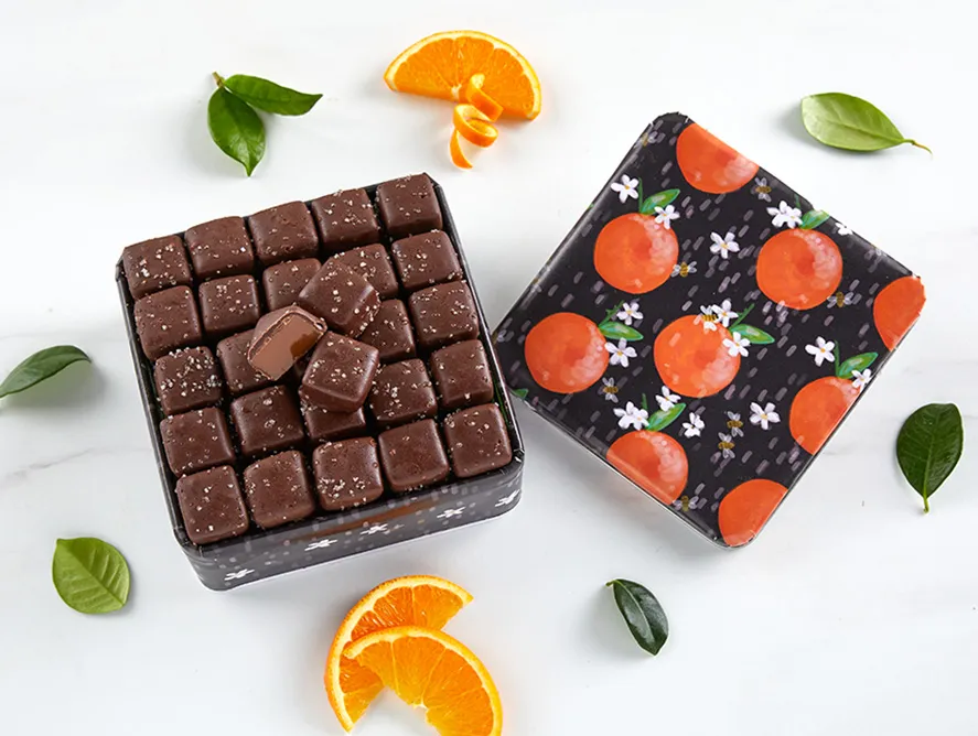 Dark Chocolate Sea Salt Caramels in Orange Delight Tin