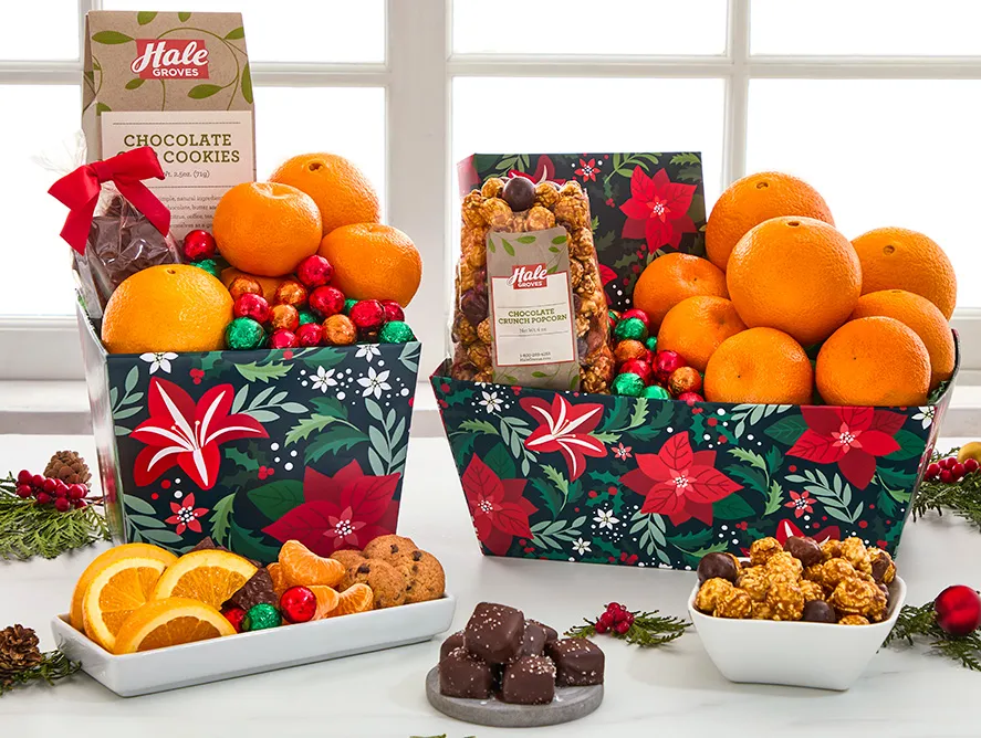 Packed in our exclusive, festive boxes are premium fruit and treats sure to make your warm wishes felt. The Festive Floral Basket contains five pieces of high-quality citrus plus Chocolate Chip Cookies, Foil-Wrapped Milk Chocolate Balls, and Toffee Bark. The Deluxe Festive Floral Basket contains eight pieces of citrus plus Foil-Wrapped Milk Chocolate Balls, Chocolate Crunch Popcorn, and a box of Dark Chocolate Salted Caramels.