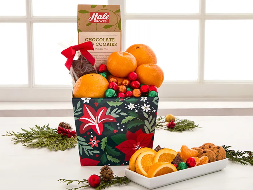 Packed in our exclusive, festive boxes are premium fruit and treats sure to make your warm wishes felt. The Festive Floral Basket contains five pieces of high-quality citrus plus Chocolate Chip Cookies, Foil-Wrapped Milk Chocolate Balls, and Toffee Bark. The Deluxe Festive Floral Basket contains eight pieces of citrus plus Foil-Wrapped Milk Chocolate Balls, Chocolate Crunch Popcorn, and a box of Dark Chocolate Salted Caramels.
