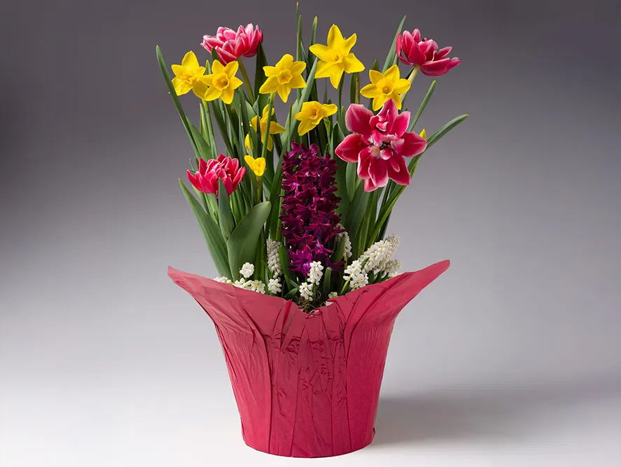 Your recipient will receive a potful of joy in the form of a grower's pot wrapped in raspberry-pink paper and pre-planted with bulbs that emerge into colorful, mood-lifting blooms over a period of several weeks: bright gold daffodils, radiant pink tulips, a deep purple hyacinth and snowy, delicate muscari.