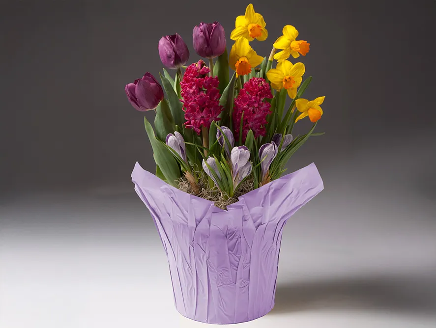 Your recipient will enjoy spring to the fullest while watching this lovely gift garden bloom before their eyes! Unlike cut flowers that fade within days, our covered grower's pot contains an assortment of hyacinth, crocus, narcissus and tulip bulbs that bloom into beautiful shades of purples, pink and yellow, like a happy springtime day brought indoors.