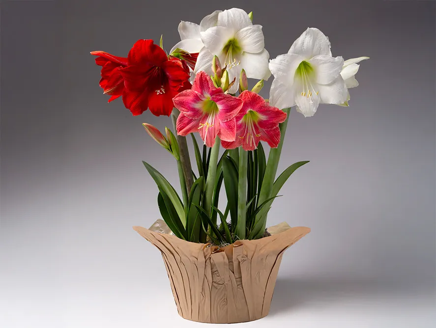 Instead of the usual poinsettia plant, present a hostess, co-worker or loved one with a Holiday Amaryllis Bulb Garden! Pre-planted in a grower's pot wrapped and ready to gift. This garden includes one red, one white and two pink mini amaryllis. These premium Amaryllis bulbs will produce tall, striking flowers in a few weeks' time. A perfect gift for brightening anyone's winter!