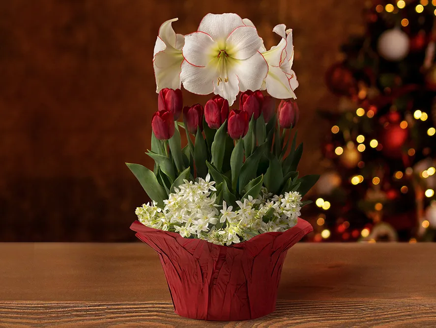 Celebrate the season with fresh, sweetly scented flowers in shades of festive red-and-white! Pre-planted in an 8" grower's pot wrapped in shiny red foil are nineteen flowering bulbs: a striking Picasso Amaryllis reigns over the rest, producing a showy cluster of white blooms with a pencil-fine red border; just below, eight crimson tulips add a vivid, cranberry-red splash; at their base tumble ten snowy Balansae Paperweights with their delicate, star-shaped blossoms which, fittingly, give them their other name – Star of Bethlehem. Unlike cut flowers which fade in a few days, this bulb garden gives your recipient the pleasure of watching them grow and bloom.