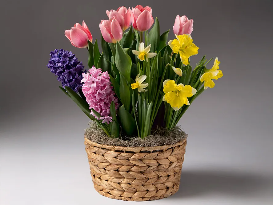 Our growers have planted seventeen popular spring bulbs in a beautiful, reusable woven gift basket. In just a few weeks they appear: nodding muscari in the deep blue of a pre-dawn sky and fragrant hyacinths that call to mind the rosy pink of clouds at twilight. Above, daffodils and tulips fling their golden and orange-pink hues over the whole like the rays of the sun at noon.