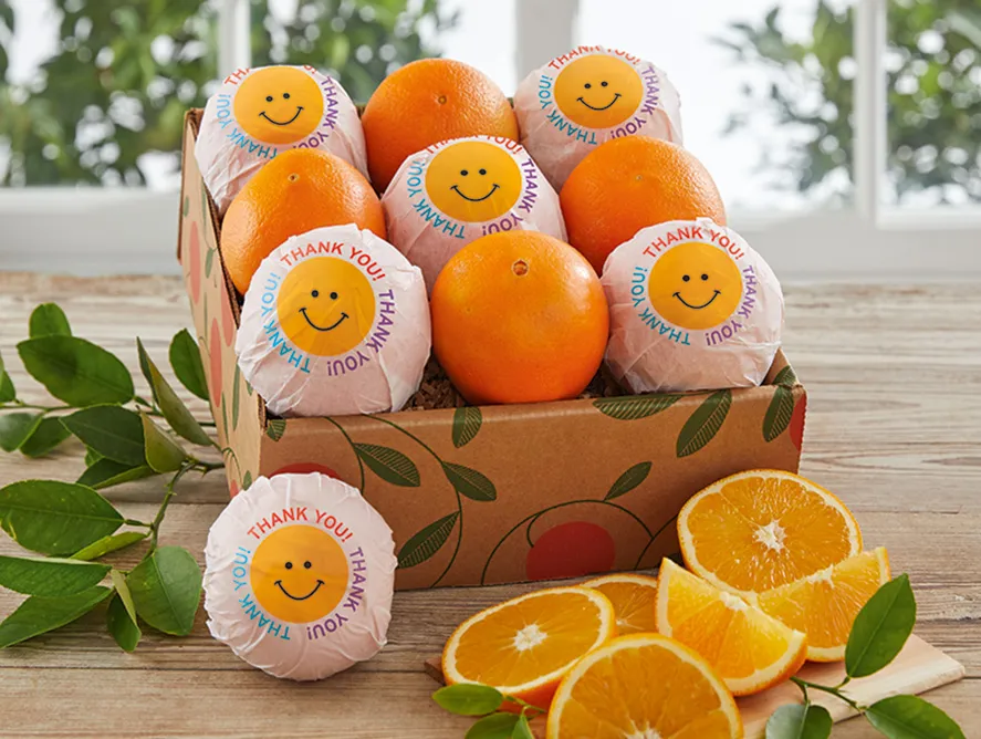 Sweet, seedless and bursting with juicy flavor, our premium Navels are always received joyfully. When we wrap them in our smiley face tissue paper stamped with your Thank You greeting, they’re even more special!
